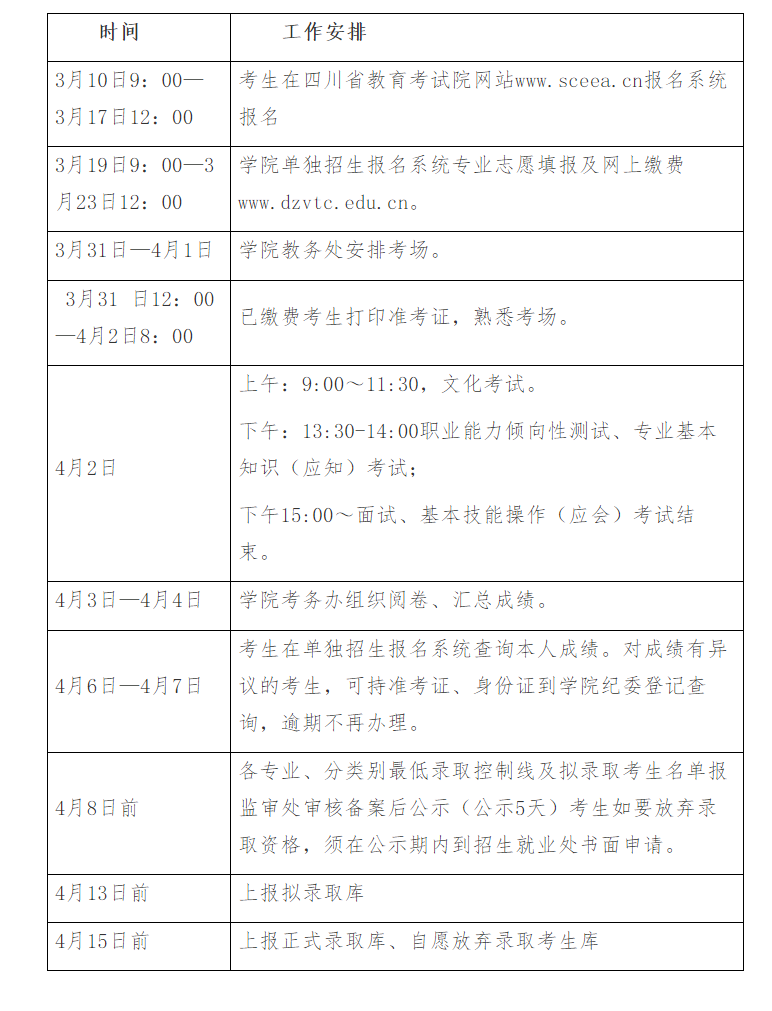 (二)学校确认:在四川省教育考试院网站报考我院的考生,应于 2022 年 3 月 19 日 9:00 至 23 日 12:00,登陆我院官网http://www.dzvtc.edu.cn,进入单独招生报名系统,按要求填报专业志愿及其它相关信息。信息确认无误后,考生再通过单独招生报名系统缴纳报名考试费130元/人。学院原则上不接受现场专业确认和缴费,在规定时间内未通过报名系统完成专业志愿确认和缴费的考生,学院视为自动放弃单独招生报名资格。报名考试费缴纳后,不予退费;网上缴费说明在单招报名系统里。